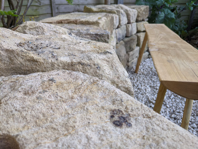The bench, made from Sweet Chestnut wood sawn from reclaimed urban trees, will frame the dry stone wall for a long time, given its super rot resistant properties.