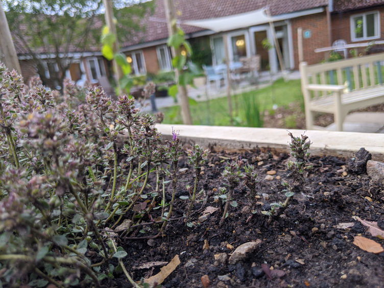 Three reclaimed timber raised beds are built with space underneath such that they are suitable for both wheelchair and standing access. Planted within the beds are three patches of different, carpeting low-growing scented plants that when touched release a scent, including a Causican Mint, Creeping Thyme and Chamomile. Apart from these plants the beds are un-planted, offering a designated and manageable zone for the staff and residents to plant annual veg and bedding plants in.