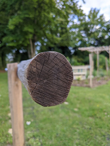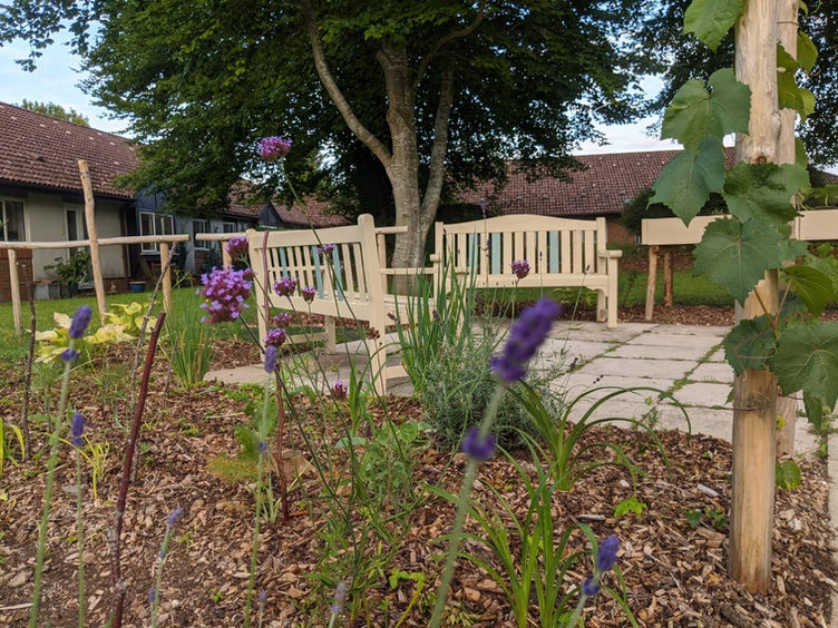 The garden now consists of a circular path, this was created in a low-cost way by installing a reinforced grass path. Encircled by a tactile hardwood handrail, the path is zimmer-frame and wheelchair friendly, and also provides a safer CFH (critical fall height) than traditional, more expensive path options. The grass grows through the matting, allowing for year-round use, and the sensation of being amongst grass, but safely. They also increase the 'green to grey ratio' - grey being hard landscaped areas such as patios. Having a high green to grey ratio plays an important role in the healing nature of outdoor spaces.